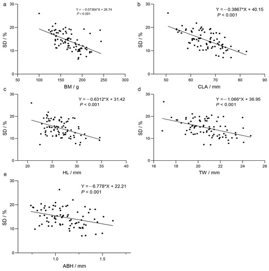 Further analysis using linear regression indicated a negative correlation between SD and several morphometric indices, including BM, CLA, HL, TW, and ASEH. This implies that the number of spines per unit area decreases as these body size parameters increase (Figure 3; Table S2).