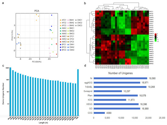 Unigene assembly and basic annotation. (a) PCA analysis demonstrating variations across 27 distinct sample sets. (b) Heatmap of correlation values (R2) for chest or abdominal skin samples. (c) Distribution of unigene lengths. (d) Statistics on the number of identified annotations.
