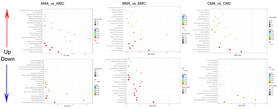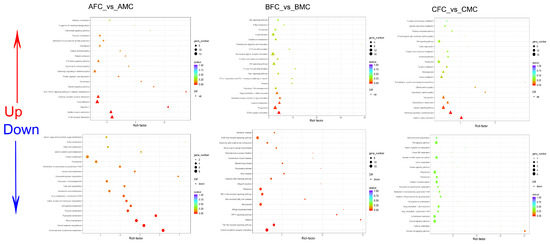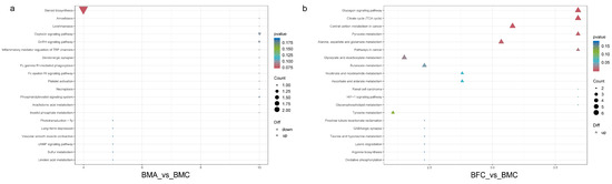 KEGG pathway enrichment analysis of DEMs for BMA_vs_BMC (a) and BFC_vs_BMC (b).