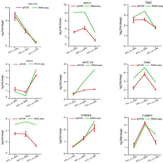 Nine DEGs were selected randomly and validated via quantitative polymerase chain reaction (qPCR) to confirm the RNA-Seq data and the gene expression profiles illustrated in Figure 7. All nine sets of specific primers successfully amplified PCR products of the anticipated sizes, confirming their efficacy for DEG validation. The amplification efficiency of these DEGs was quantified as log2 fold changes, and when aligned with the RNA-Seq results, the expression patterns discerned by qPCR were consistent with those derived through RNA-Seq, thereby validating the accuracy of the RNA-Seq data. Consequently, these identified DEGs provide a crucial reference for future research into the molecular mechanisms underlying seasonal variations in Q. spinosa spines.