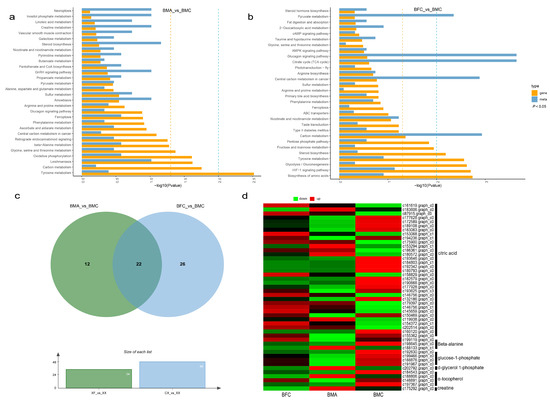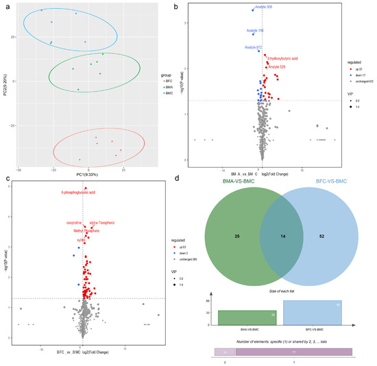 Metabolome analysis of BMA, BMC, and BFC. (a) PCA plot. Blue, green, and red points represent BMC, BMA, and BFC, respectively. (b) BMA_vs_BMC. (c) BFC_vs_BMC. (d) Venn diagram of DEMs.