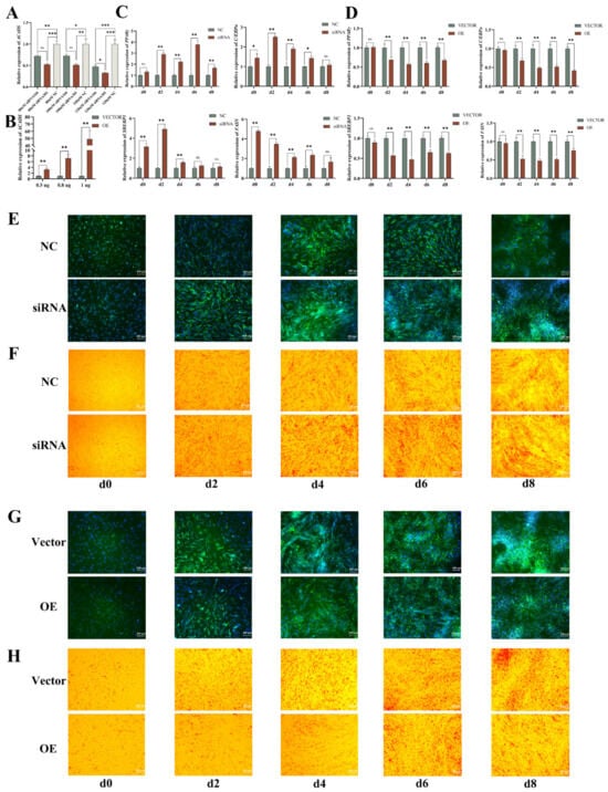 - Tang, L. Regulation Mechanism of Bovine ADIG Gene on Adipocyte Differentiation and Promoter Activity Analysis. Master’s Thesis, Ningxia University, Yinchuan, China, 2021. [Google Scholar]