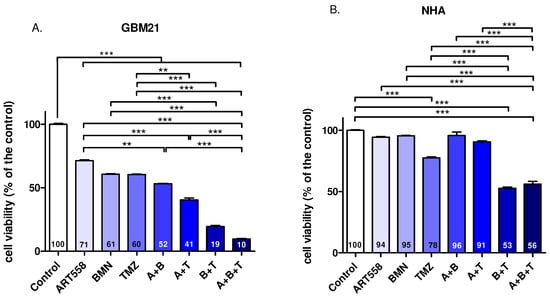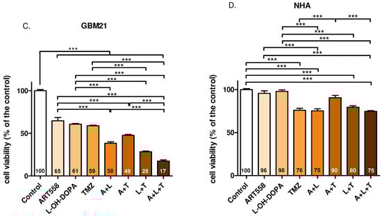 The effect of DNA repair protein inhibition and treatment with an alkylating agent and their combinations on the GBM21 cancer cell line. (A)—variant with PARPi, (C)—variant with RAD52i and normal NHA (B) variant with PARPi, (D)—variant with RAD52i cell viability shown as the percentage of the control. The numbers on the bars show the mean values. Three independent experiments were performed and the results are shown as the mean ± standard error of the mean (SEM). ** p-value ≤ 0.01, *** p-value ≤ 0.001; A—ART558, B—BMN673, L—L-OH-DOPA, T—TMZ.