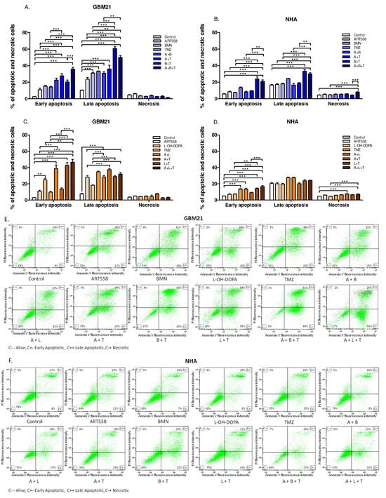Proapoptotic effect of DNA repair protein inhibition and an alkylating agent and their combinations on the GBM21 cancer cell line. (A)—variant with PARPi, (C)—variant with RAD52i and normal NHA (B)—variant with PARPi, (D)—variant with RAD52i cells, shown as a percentage of cells in the corresponding stage in graphs and representative dot-plots (E)—GBM21, (F)—NHA). Cells were stained with propidium iodide (PI) and annexin V. Annexin V has strong affinity to phosphatidylserine, which appears on the cell’s surface during early apoptosis, while propidium iodide binds to DNA by penetrating through the fragmented cell membrane, which is characteristic of necrosis and the late stages of apoptosis. Three independent experiments were performed, and the results are shown as the mean ± standard error of the mean (SEM). * p ≤ 0.05, ** p ≤ 0.01, *** p-value ≤ 0.001; A—ART558, B—BMN673, L—L-OH-DOPA, T—TMZ. C−−—Living cells, C+−—Early Apoptotic cells, C++—Late Apoptotic cells, C−+—Necrotic cells.