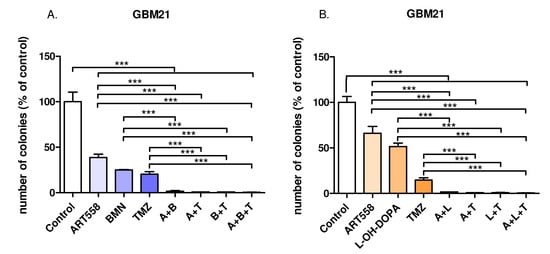 Reduction in colony formation induced by DNA repair protein inhibition and an alkylating agent and their combinations in GBM21 cells shown in graphs (A)—variant with PARPi, (B)—variant with RAD52i and photos of the representative plate wells (C)—variant with PARPi, (D)—variant with RAD52i. Three independent experiments were performed, and the results are shown as the mean ± standard error of the mean (SEM). *** p-value ≤ 0.001; A—ART558, B—BMN673, L—L-OH-DOPA, T—TMZ.