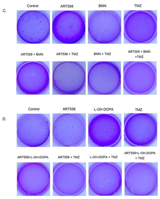We used the clonogenic assay to measure the ability of single cancer cells to proliferate and form colonies after treatment with the inhibitors and the cytotoxic drug. Decreased cell proliferation, visualized as a significant reduction in colony formation, was observed between the control and each treatment variant. Also, in comparison to the single inhibition of Polθ, the combination of Polθi and PARPi or RAD52i or dual inhibition with TMZ gave statistically significant reduction in colony number. The results are also presented in the photos (Figure 4C,D).