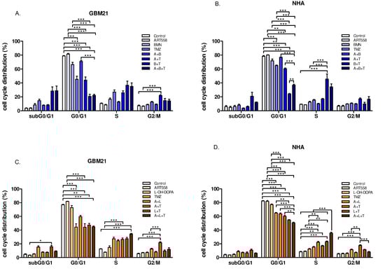To analyze the influence of the compounds on cell cycle distribution in glioblastoma and NHA populations, cells fixed with 70% cold ethanol were stained with propidium iodide with the addition of RNase (BD Biosciences) and analyzed by flow cytometry.