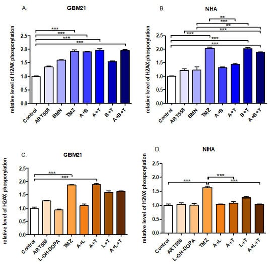 H2AX phosphorylation expressed as level of fluorescence signal relative to the control induced by the inhibition of DNA repair proteins and alkylating agent treatment and their combinations in GBM21 (A)—variant with PARPi, (C)—variant with RAD52i and NHA (B)—variant with PARPi, (D)—variant with RAD52i cells. At least two independent experiments were performed, and the results are shown as the mean ± standard error of the mean (SEM). ** p ≤ 0.01, *** p-value ≤ 0.001; A—ART558, B—BMN673, L—L-OH-DOPA, T—TMZ.