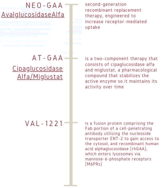 Different types of molecular drugs involved in gene-expression regulation. Avalglucosidase alpha, or NeoGAA, is a drug for enzyme replacement therapy, specifically designed for Pompe disease. Avalglucosidase alpha is a recombinant form of GAA that restores deficient enzyme levels. First developed by Sanofi Genzyme, avalglucosidase alpha is a chemically modified version of alglucosidase alpha, where synthetic bis-phosphorylated oligosaccharides were attached to the structure to improve cellular uptake of the drug and better muscle targeting. Pombiliti + Opfolda (cipaglucosidase alpha/miglustat), formerly known as AT-GAA, is an approved combination therapy for adults with late-onset Pompe disease, or LOPD. VAL-1221 is a fusion protein comprising the Fab portion of a cell-penetrating antibody utilizing the nucleoside transporter ENT-2 to gain access to the cytosol, and recombinant human acid alpha glucosidase (rhGAA), which enters lysosomes via mannose-6- phosphate receptors (M6PRs).