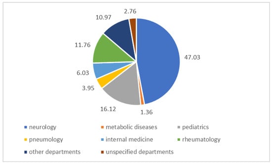 We evaluated the enzyme activity of 2934 subjects, 1670 males and 1264 females, divided by age. Mean age was 31 years at time of analysis: 165 subjects aged 0 to 1 years old suspected to have IOPD, and 2769 subjects over 1 year old suspected to have LOPD. The typical clinical features reported in Toscano et al. were found in all our examined subjects [49]. Due to the importance of scientific health research to date, a study of subjects from different hospital departments was conducted to delineate the clinical phenomenon in an observational and analytical view. DBS received with suspected PD came from: 1380 neurology (47.03%), 40 metabolic diseases (1.36%), 473 pediatrics (16.12%), 116 pneumology (3.95%), 177 internal medicine (6.03%), 345 rheumatology (11.76%), 322 from other departments such as cardiology, anesthesia and reanimation, hematology, and medical genetics (10.97%), and 81 from unspecified departments (2.76%) (Figure 2).