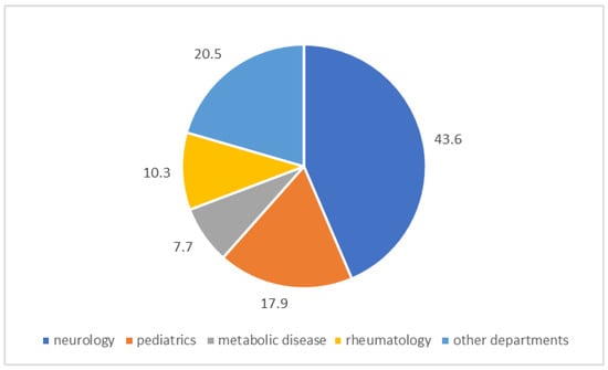 In our study, we identified a total of 39 subjects with PD, including 27 with two classic mutations in compound heterozygosity, 8 with mutations in homozygosity, and 4 with one causative mutation associated with a large deletion. Specifically, as shown in Figure 3, these subjects came from the following departments: 17 from neurology (43.6%), 4 from rheumatology (10.3%), 7 from pediatrics (17.9%), 3 from metabolic diseases (7.7%), and 8 from other departments (20.5%).