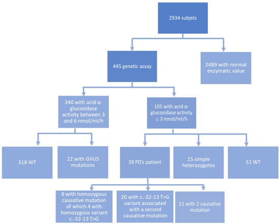 Our data collected in recent years allowed the identification of patients with a pathological value of alpha-acid glucosidase enzyme activity and the presence of GAA mutations. The biochemical and genetic investigations that led to PD diagnosis were performed at the Centre for Research and Diagnosis of Lysosomal Storage Disorders at IRIB-CNR in Palermo, and were approved by the Hospital Ethics Committee of the University of Palermo (Sicily, Italy). Signed informed consent was obtained from patients. For each patient, clinical history and laboratory data were collected in a case report form.