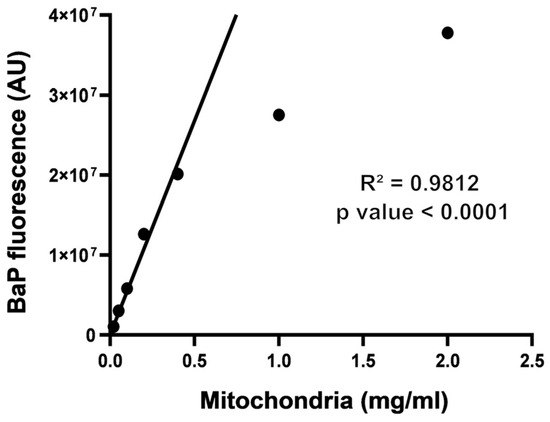 Isolated mitochondria were diluted at different concentrations and incubated with excess molar BaP (5 µM). We used the ability to detect BaP fluorescence (Ex: 377 nm, Em: 418 nm) to measure the capacity of BaP to bind mitochondria. The amount of BaP-related fluorescence increases with mitochondrial concentration and the linear positive correlation up to 0.4 mg/mL of mitochondria (R2 = 0.9812; p-value < 0.001), where it seems to saturate. Figure 1 indicates that BaP is indeed binding to mitochondria. This is consistent with the lipophilic properties of BaP, which cause it to bind to the mitochondrial membranes.