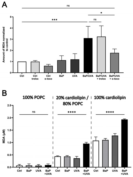 Lipid peroxidation in BaP- and/or UVAssl-exposed isolated mitochondria and cardiolipin-containing lipid vesicles. Lipid peroxidation was assessed by measuring MDA, a by-product of lipid peroxidation. (A) Isolated mitochondria pre-treated or not with antioxidants were incubated with 500 nM of BaP and/or 200 kJ/m2 of UVAssl. Exposure to BaP or UVAssl alone does not lead to the significant generation of MDA. BaP and UVAssl co-exposure leads to a significant production of MDA (3-fold the control level). α-Tocopherol significantly decreases BaP/UVAssl-induced MDA production, whereas Trolox has no effect. (B) Lipid peroxidation was determined in MLVs containing cardiolipin. MLVs containing 100% POPC, 100% cardiolipin or a mix of cardiolipin and POPC at a ratio of 20:80 were exposed to 500 nM BaP and/or to 200 kJ/m2 UVAssl. No MDA formation could be measured in MLVs containing 100% POPC exposed to BaP and/or UVAssl. For MLVs containing a mix of cardiolipin and POPC at a ratio of 20:80, the treatment with either BaP or UVAssl does not affect the basal MDA levels. However, when co-exposed to BaP and UVAssl, we found a significant increase (2-fold) in lipid peroxidation. MLVs containing 100% cardiolipin have higher basal levels of MDA, with a significant increase only when they are co-exposed to BaP and UVAssl. Values are mean ± SD (n = 3). ns = non-significant; * p < 0.05; *** p < 0.001; **** p < 0.0001.