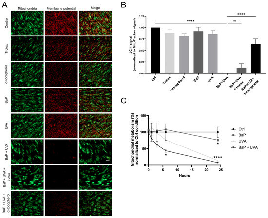 Lipid peroxidation in the inner mitochondrial membrane and the alteration of the mitochondrial network by co-exposure to UVAssl/BaP could impact mitochondrial activity. We indeed showed that co-exposure to BaP and UVAssl caused a loss of mitochondrial membrane potential (Figure 4A,B) associated with a decrease in mitochondrial metabolism (Figure 4C). Moreover, we showed that α-tocopherol significantly prevents membrane potential loss caused by UVAssl/BaP co-exposure, which highlights the involvement of UVAssl/BAP-induced lipid peroxidation in the loss of membrane potential.
