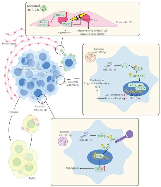- Hsu, Y.L.; Hung, J.Y.; Chang, W.A.; Lin, Y.S.; Pan, Y.C.; Tsai, P.H.; Wu, C.Y.; Kuo, P.L. Hypoxic lung cancer-secreted exosomal miR-23a increased angiogenesis and vascular permeability by targeting prolyl hydroxylase and tight junction protein ZO-1. Oncogene 2017, 36, 4929–4942. [Google Scholar] [CrossRef]