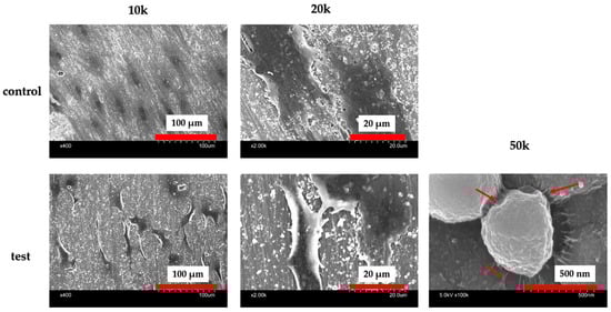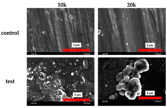SEM analysis of the control and test groups. Silicon nitride crystal deposition was observed on the surface of the material in the experimental group.