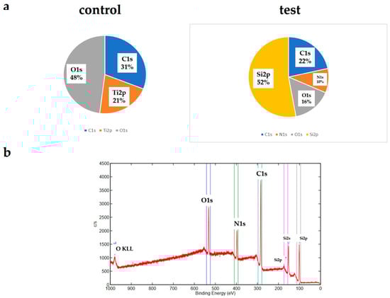 XPS analysis of the control and test groups (a). The XPS spectra of a wide scan of the test group (b). The presence of Si and N, the main elements of silicon nitride, was observed on the material surfaces of the experimental group, while Ti was not detected.