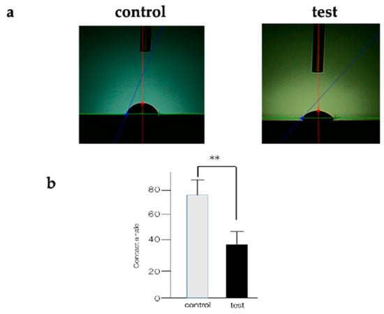 Contact angle analysis of the control and test groups (a). A decrease in contact angle was observed in the experimental group. The contact angle of the test group was lower than that of the control group (n = 4, ** p < 0.01) (b).