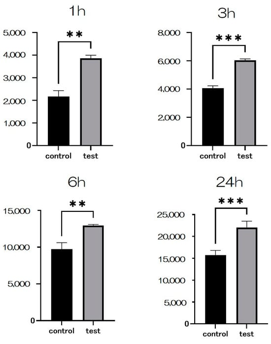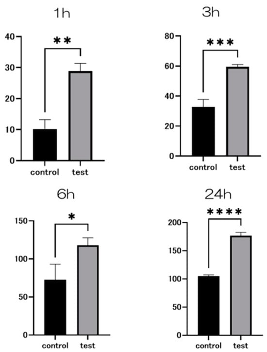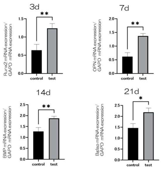 At seven and fourteen days after the start of the culture, the material surface of the test group showed significantly higher levels of alkaline phosphatase (ALP) expression compared to the control group (Figure 7). Similarly, at 21 and 28 days post-culture, the test group’s material surface exhibited significantly greater calcium deposition than that of the control group. Gene expression related to the induction of hard tissue differentiation was evaluated on the material surfaces of both test and control groups (Figure 8). The assay was conducted at specific time points unique to each gene. Notably, gene expression on the material surface of the test group was consistently higher than that of the control group (Figure 9).