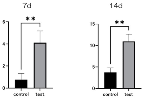 Alkaline phosphatase (ALP) expression in bone marrow cells at days 7 and 14 after the start of the culture was significantly higher on the material surface of the test group compared to the control group (n = 4, ** p < 0.01).
