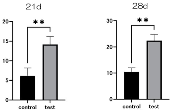 Calcium deposition in bone marrow cells at days 21 and 28 after the start of the culture was significantly higher on the material surface of the test group compared to the control group (n = 4, ** p < 0.01).