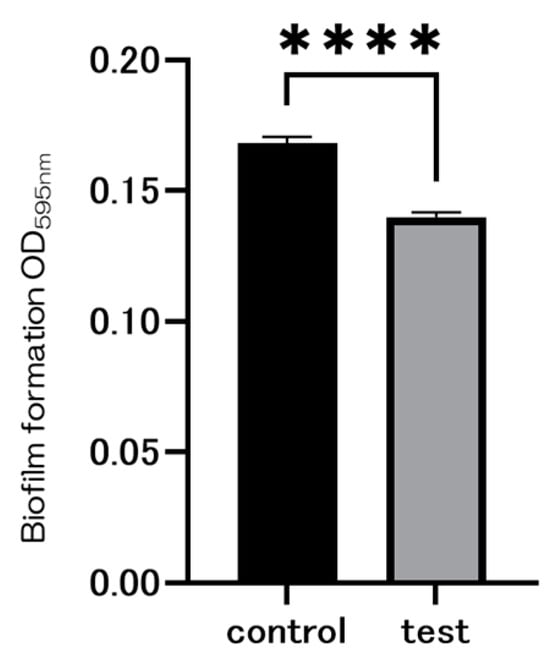 The results of the bacterial adhesion test using Staphylococcus aureus biofilms are presented. Significantly lower values were observed in the test group compared to the control group (n = 4, **** p < 0.0001).
