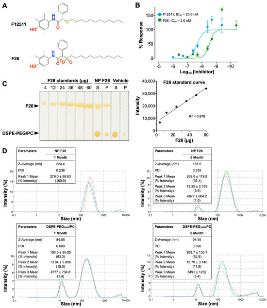 Characterization of F26 and DSPE-PEG2000/PC nanoparticles encapsulating F26 (NP F26). (A) Chemical structures of F12511 (top) and F26 (bottom). (B) Dose–response curves of F12511 and F26 against ACAT in MEFs. The lines show the non-linear fit used to determine the IC50. Each data point represents mean ± SD. (C) F26 encapsulation efficiency in NP F26 was analyzed by TLC with iodine staining (left). The standard curve obtained by plotting the F26 gradient standard (right) and encapsulation efficiency was calculated by using the intensity of the supernatant of NP F26. (D) NP F26 and DSPE-PEG2000/PC nanoparticles were analyzed by a Zetasizer Nano ZS at 1 and 6 months after formulation. All experiments were performed in triplicate, with each measurement represented by a different color line.; peaks are expressed as mean ± SD, and Z-Average and PDI are shown with mean values in the inserted tables. The peak order is by the area under the peak.