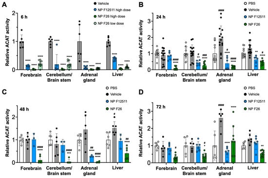 F26 inhibits ACAT activity in the forebrain, cerebellum/brain stem, adrenal gland, and liver after a single IV administration of NP F26 to WT mice at (A) 6 h, (B) 24 h, (C) 48 h, (D) 72 h time points. WT mice were injected with either PBS, vehicle, NP F12511 (46 mg/kg, high dose), or NP F26 (17 mg/kg, low dose, or 51 mg/kg, high dose). Relative ACAT activity was measured by using a mixed micelle assay. (B–D) NP F12511 (46 mg/kg) and NP F26 (51 mg/kg) were treated. Bars represent mean ± SD. Each data point represents a triplicate for each mouse. (n = 2–5/group). p-value determined using two-way ANOVA followed by Tukey’s multiple comparisons test. # showed statistical significance compared to PBS, and * showed statistical significance compared to the vehicle. #,* p < 0.05, ##,** p < 0.01, ###,*** p < 0.001, ####,**** p < 0.0001.