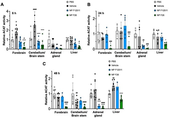 A previous study demonstrated that DSPE-PEG2000/PC-based nanoparticles serve as an for ACAT inhibitors, particularly F12511, facilitating their delivery to the brain in mouse models [28]. A single IV administration of NP F12511 in wild-type (WT) mice significantly inhibited ACAT activity in various tissues, including the forebrain, cerebellum/brain stem, adrenal gland, and liver [28]. We expanded the study to include four groups: PBS, vehicle, NP F12511, and NP F26, each administered via a single intravenous (IV) injection to assess comparative efficacy and pharmacodynamics studies. We monitored ACAT activity in these tissues at 6 h, 24 h, 48 h, and 72 h post-administration (Figure 3). Figure 3A shows that a high dose (46 mg/kg) of NP F12511, and both low (17 mg/kg) and high (51 mg/kg) doses of NP F26, significantly reduced ACAT activity at 4 h post-administration in the forebrain, cerebellum/brain stem, adrenal gland, and liver. Notably, the low dose of NP F26 exhibited inhibitory effects comparable to the high dose of NP F12511, demonstrating NP F26’s potency at 4 h post-administration. This observation aligns with our prior in vitro findings, confirming that F26 is a more potent ACAT1 inhibitor than F12511 (Figure 2). Furthermore, while NP F12511 (46 mg/kg) showed its efficacy up to only 12 h post-administration in our previous study, NP F26 (51 mg/kg) continued to display significant efficacy, reducing ACAT activity in the forebrain and cerebellum/brain stem up to 72 h after administration (Figure 3B–D) [28]. This sustained activity highlighted the enhanced duration of action of NP F26 compared to both PBS- and vehicle-treated groups, as well as NP F12511. We noted that although the ACAT activity in the forebrain and cerebellum/brain stem of NP F12511-treated mice largely returned to baseline by 24 h post-injection, the ACAT activity in the adrenal gland remained significantly reduced until 48 h, similar to the NP F26 treatment. Interestingly, we observed that the vehicle group exhibited changes in ACAT activity compared to the PBS group, indicating an unexpected but notable effect of the vehicle itself. This underscores the importance of including both PBS and vehicle controls to accurately assess the specific impacts of nanoparticle formulations. By 72 h post-administration, the ACAT activity in the adrenal glands of both NP F12511 and NP F26-treated mice was altered relative to the vehicle group, suggesting that a preferential accumulation of the vehicle and ACAT inhibitors in the adrenal gland might occur. Additionally, ACAT activity in the liver was significantly reduced by both NP F12511 (up to 24 h) and NP F26 (up to 72 h), though not as pronounced as in the brain. This suggests that the mouse liver, predominantly expressing ACAT2, might be less affected by F26 [14]. Together, these findings indicate that a single IV administration of NP F26 can significantly inhibit ACAT activity for up to 72 h in the brain and for 48 h in the adrenal gland and liver, highlighting its enhanced and prolonged efficacy compared to NP F12511.