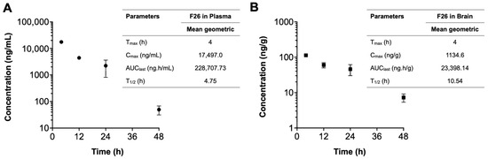 The concentration–time profiles of F26 after a single IV administration. Each plasma (A) and brain (B) sample was collected after IV administration of NP F26 at 51 mg/kg dose in three-month-old WT mice and was analyzed via LC-MS/MS. Individual points represent mean ± SD for two independent animals (n = 2). The pharmacokinetic analyses were performed using a non-compartmental analysis, and the parameters are shown in the inserted tables. Data are presented as mean. Cmax, maximum concentration; Tmax, time to maximum concentration; AUClast, area under the concentration–time curve from zero to final observation time; T1/2, elimination half-life.