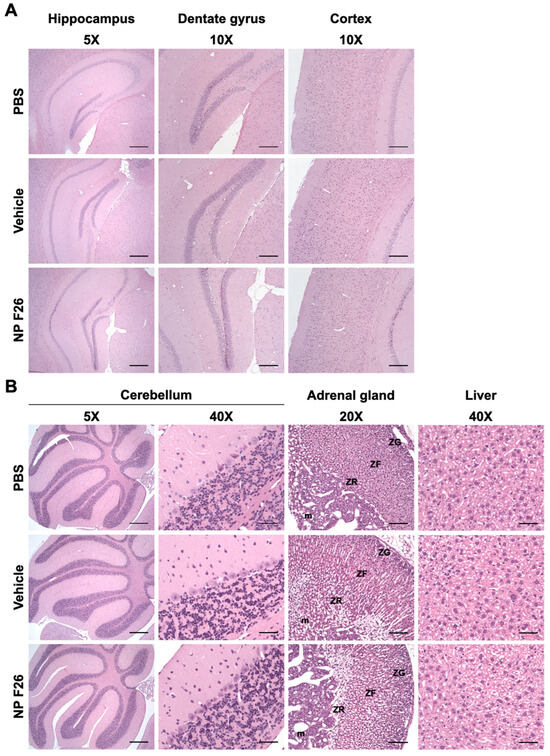 Representative images of H&E-stained histological sections of mouse tissues after 2-week IV administration of NP F26 (51 mg/kg). NP F26 treatment did not cause any histological pathology in the central nervous system and peripheral tissues compared to PBS- and vehicle-injected mouse tissues. (A) Images of hippocampus, dentate gyrus, and cortex. (B) Images of cerebellum, adrenal gland, and liver. n = 2/group. Abbreviations; ZG = zona glomerulosa, ZF = zona fasciculata, ZR = zona reticularis, m = medulla. Scale bars; 5× = 400 µm, 10× = 200 µm, 20× = 100 µm, 40× = 50 µm.