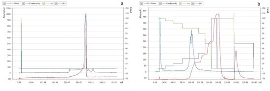 The active fractions were desalted by dialysis using a 5-kDa cut-off membrane at 4 °C. The active fractions were then further purified on a Q-μSphere column using the ClearFirst-3000 Protein Purification System. Prior to purification, the column was pre-equilibrated with deionized water at a flow rate of 1 mL/min. During the purification process, solutions containing different concentrations of sodium chloride (100 mM, 200 mM, 300 mM, and 400 mM, respectively) were used as eluents and the flow rate was again maintained at 1 mL/min. The eluted fractions were analyzed at 280 nm; the active fractions were dialyzed again at 4 °C using a 5 kDa cut-off membrane to further remove residual small molecules, and then concentrated using a rotary evaporator (Yingdi, Shanghai, China). Finally, the antibacterial activity against M. haemolytica was determined by the agar diffusion method. The samples were then subjected to molecular mass determination by SDS-PAGE.