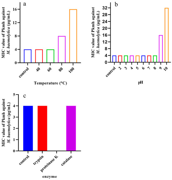 Temperature, pH, and various enzymes on the antimicrobial activity of Pkmh were tested. As shown in Figure 3, the MIC was 16 μg/mL at pH 9 and increased to 32 μg/mL at pH 10. At high temperatures of 80 °C and 100 °C the MIC was 16 μg/mL and 32 μg/mL, respectively. In addition, the antimicrobial activity of Pkmh completely disappeared in the presence of proteinase K.