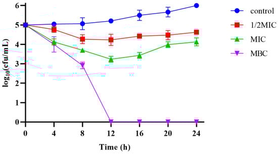 The MIC and MBC of Pkmh against M. haemolytica were 4 µg/mL and 12 µg/mL, respectively. The results of the bactericidal kinetic curves (Figure 4) showed that Pkmh was able to inhibit bacterial growth during the first 12 h at MIC and 1/2 MIC concentrations, while it was able to kill bacteria well at MBC concentrations compared to the control group.