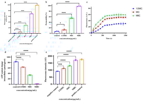 Normally, the hydrophobic fluorescent substance NPN is excluded by the outer membrane; however, when the permeability of the outer membrane is increased, NPN is taken up, leading to an increase in the fluorescence intensity of the cells []. Therefore, the outer cell membrane permeabilizing activity of Pkmh was assessed by measuring the uptake of NPN by bacterial strains. As shown in Figure 6b, Pkmh permeated the outer membrane in a concentration-dependent manner at concentrations ranging from 0.25 to 128 μg/mL. When the concentration of Pkmh exceeds 0.5 µg/mL, the permeability of the bacterial outer membrane induced by Pkmh exceeds 80%.