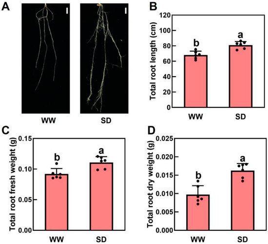 Effects of soil drying on wheat roots. (A) Representative images of wheat roots in well-watered (WW) and soil drying (SD) conditions. Scale bar = 1 cm. (B–D) Impact of soil drying on the total root length (B), root fresh weight (C), and root dry weight (D). The data in (B–D) are the mean ± standard error (n = 6). The same letter indicates no significant difference, whereas different letters indicate significant differences (p < 0.05, Duncan’s test).