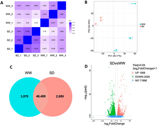 DEGs in wheat roots between well-watered (WW) and soil-drying (SD) conditions. (A) Pearson correlation coefficient of gene expression; (B) Principal components analysis of the transcriptome; (C) Venn diagram of DEGs; and (D) number of DEGs in wheat roots between the WW and SD conditions. Each point in D represents a gene, with red representing upregulated (greater than 2-fold), green representing downregulated (less than 2-fold), and blue representing genes whose expression did not change between WW and SD.