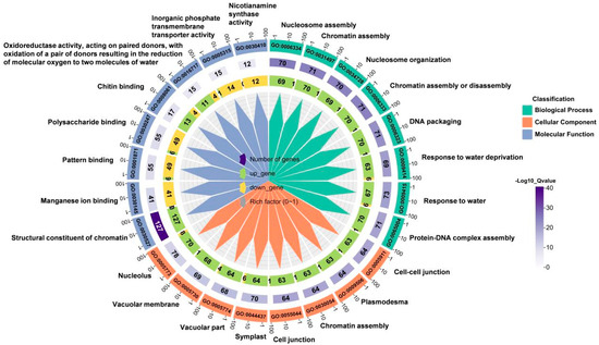 GO biological process enrichment chart of DEGs between well-watered (WW) and soil-drying (SD) conditions. The outermost circle of the image represents the term name enriched with DEGs. From outer to inner, the first layer is the GO term number, layer 2 is the number of genes in the GO term, and layer 3 shows the numbers of up- and down-regulated genes in the GO term. The color range from white to purple represents the magnitude of significance, and the gray label indicates the proportion of differentially expressed genes in the enriched pathway to the total enriched genes.