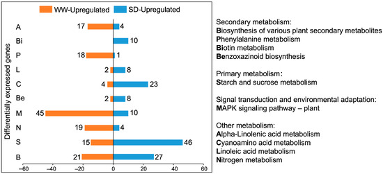 KEGG pathway enrichment chart of DEGs between well-watered (WW) and soil-drying (SD) conditions. Orange (blue) represents the number of upregulated genes under WW (SD) conditions.