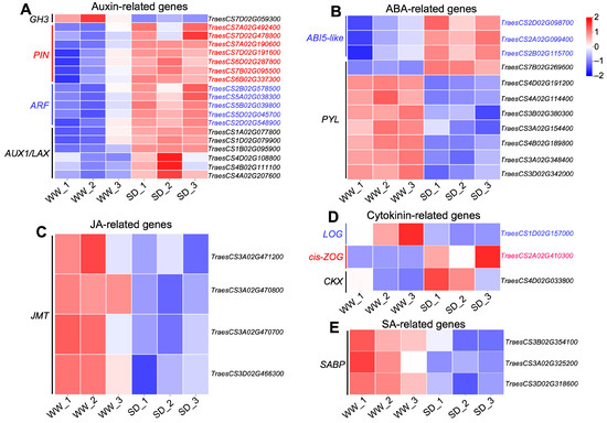 Heatmap of DEGs related to phytohormones between well-watered (WW) and soil-drying (SD) conditions. Heat map of auxin-related (A), ABA-related (B), JA-related (C), cytokinin-related (D), and SA-related (E) DEGs between WW and SD. The color of the heat map represents the expression of genes, with blue (red) indicating low (high) gene expression.