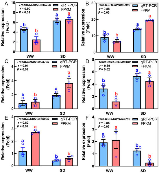Correlation analysis between transcriptome profiling and qRT-PCR verification results of phytohormone-related genes in wheat roots under well-watered (WW) and soil-drying (SD) conditions. Auxin—(A,B), ABA—(C,D), and JA-related (E,F) gene expression in wheat roots under WW and SD conditions. The data in (A–F) are presented using mean ± standard error (n = 3). FPKM: the number of transcripts per million mapped reads per thousand bases of transcription. The same letter indicates no significant difference, while different letters indicate significant differences (p < 0.05, Student’s t-test).