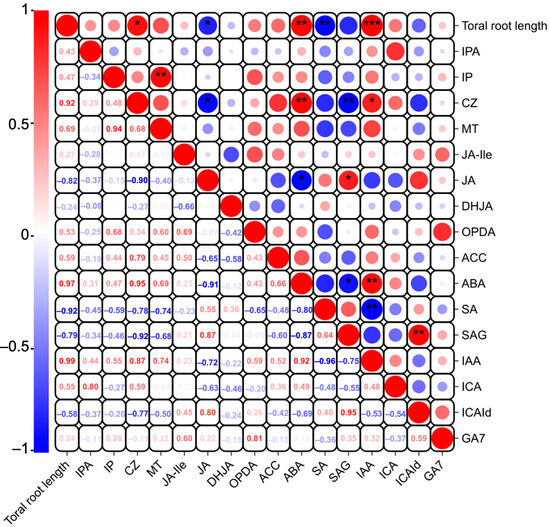 Correlation analysis of total root length and plant hormones in wheat roots between well-watered (WW) and soil-drying (SD) conditions. Asterisk indicates a significant correlation: * represents p < 0.05, ** represent p < 0.01, and *** represent p < 0.001. Red indicates positive correlations, while blue indicates negative ones. The size of the circle is positively correlated with the Pearson correlation coefficient.