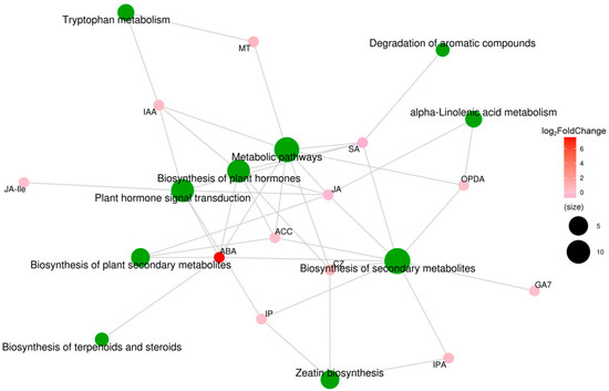 Metabolite molecular network of differentially expressed plant hormones in wheat roots between well-watered (WW) and soil-drying (SD) conditions. Green dots represent metabolic pathways, and other dots represent metabolite molecules. The size of each metabolic pathway point represents the number of metabolite molecules connected to it; the greater the number, the larger the point. Metabolite molecular points indicate the size of log2Fold Change values through gradual color changes, and multiple groups with no metabolite log2Fold Change information are compared.