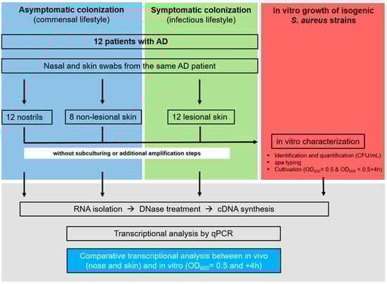 Li P, Schulte J, Wurpts G, Hornef MW, Wolz C, Yazdi AS, Burian M. Transcriptional Profiling of Staphylococcus aureus during the Transition from Asymptomatic Nasal Colonization to Skin Colonization/Infection in Patients with Atopic Dermatitis. International Journal of Molecular Sciences. 2024; 25(17):9165. https://doi.org/10.3390/ijms25179165