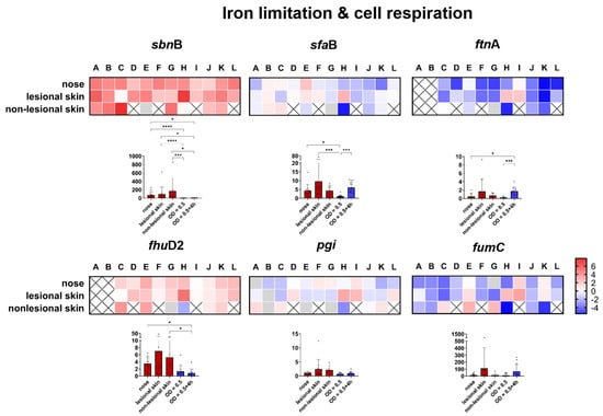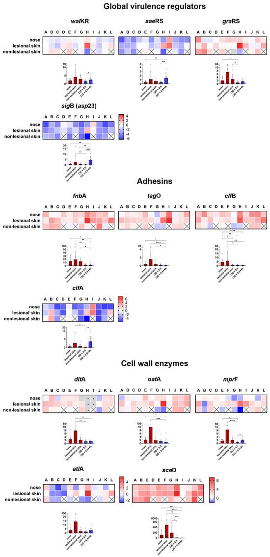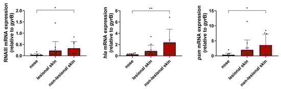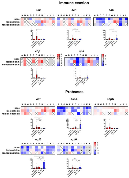 - Cruz, A.R.; van Strijp, J.A.G.; Bagnoli, F.; Manetti, A.G.O. Virulence Gene Expression of Staphylococcus aureus in Human Skin. Front. Microbiol. 2021, 12, 692023. [Google Scholar] [CrossRef] [PubMed]