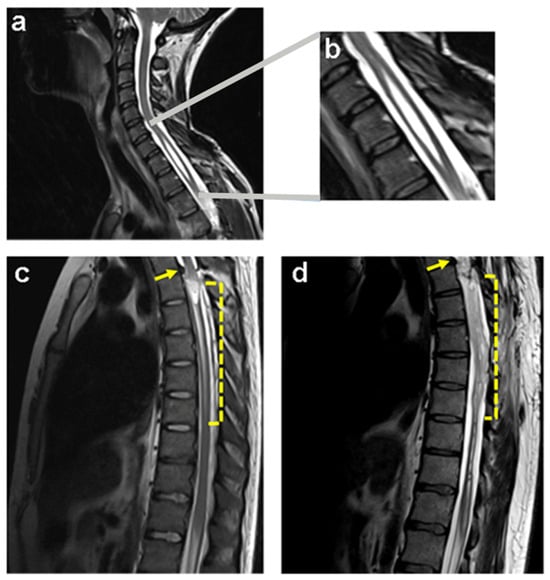 Subacute and chronic lesions of the spinal cord in human patients observed by magnetic resonance imaging. Syringomyelia cyst in a child due to idiopathic causes (a) shows the enlargement of the cavity within the spinal cord (b). The dotted areas (c,d) indicate a decade of evolution in a patient from subacute injury (c) to chronic spinal injury (d) produced by traumatic disk herniation at the second to third vertebral thoracic levels, T2–T3 (see arrows). Note the formation of syringomyelia below the lesion at the beginning (c) and how ten years later, the spinal cord becomes necrotic (d).