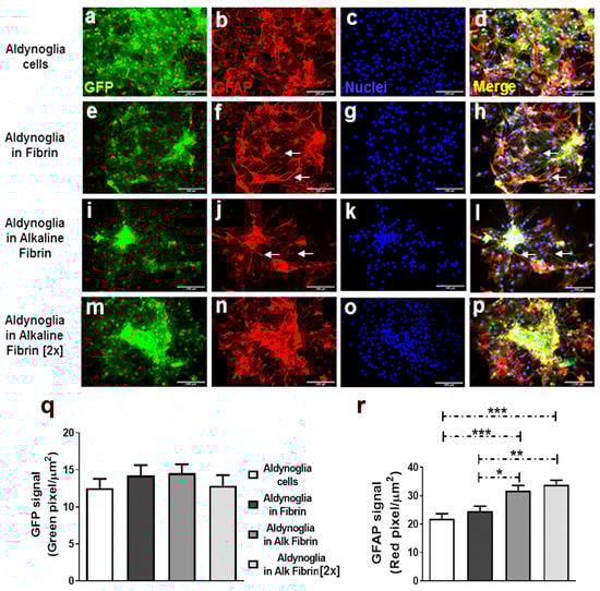 Increasing expression of GFAP after differentiation of neural precursor cells to aldynoglia phenotype in alkaline fibrin hydrogels. After one week in cell culture, aldynoglia–GFP cells in fibrin hydrogels made clusters (e,i,m) in the GFP signaling areas, but not in control cells (a). No significant differences in constitutive GFP expression were obtained in areas for cell differentiation analysis (q). However, in these GFP+ areas, the alkaline fibrin variants had significantly higher GFAP expression (j,n) than controls (b,f), as shown in (r). The white arrows point to GFAP bridges between clusters of aldynoglia. Nuclei revealed by Hoechst agent (c,g,k,o) and merging zones of GFP, GFAP signals (d,h,l,p) are shown One-way ANOVA followed by Tukey’s test were used in statistical analysis (* p = 0.01, ** p = 0.001 and *** p = 0.0001); magnification bars at 500 µm.