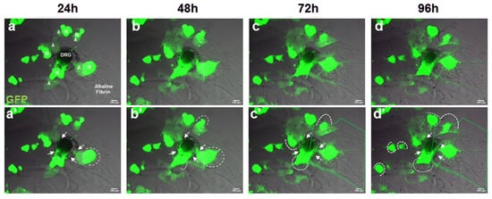Dynamic cellular interaction of aldynoglia–GFP cells and DRG explants in alkaline fibrin hydrogel. Cell cultures was recorded by time-lapse video up to 96 h, and profuse migration of aldynoglia–GFP cells to DRGs was observed in this period (a–d). Differentiation of neurospheres into aldynoglia inside alkaline fibrin began at approximately 24 h in cell culture (a). Aldynoglia–GFP interaction with DRG explant, fibrin degradation, and cell migration are indicated (a’–d’). Alkaline fibrin degradation and massive cellular invasion of DRGs by aldynoglia–GFP cells are denoted by white dotted lines and arrows, respectively (a’–d’). On the third and fourth day (c,d), large areas of cell migration with aldynoglia–GFP and ganglion cells were also observed throughout the alkaline fibrin matrix—see green dotted area (c’,d’). A, aldynoglia; DRG, dorsal root ganglion; N, neurosphere; arrowheads, aldynoglia–GFP and DRG cell contact site; white dotted line, zones of alkaline fibrin hydrogel degradation by aldynoglia–GFP cells; green dotted area, cell migration zone in alkaline fibrin.