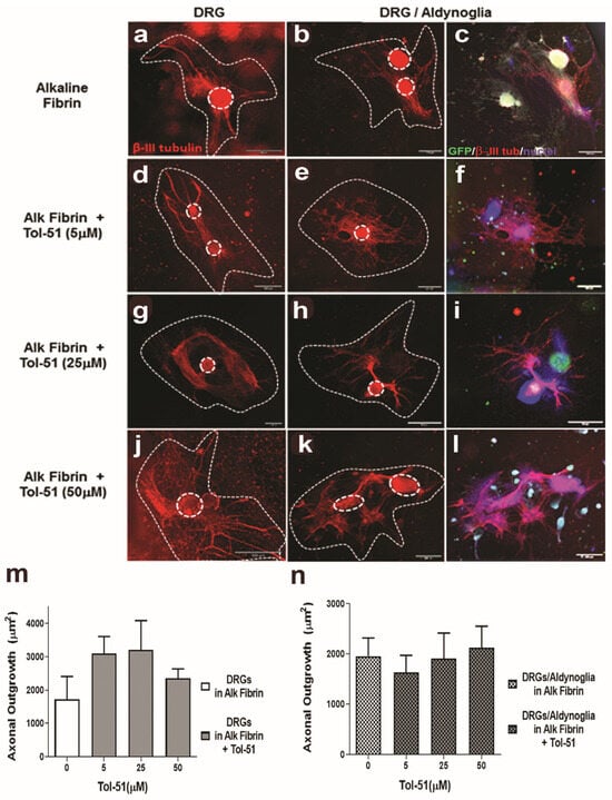 Alkaline fibrin and Tol-51 sulfoglycolipid during axonal growth promotion of spinal neurons by aldynoglia. DRGs were plated on alkaline fibrin containing aldynoglia cells and incubated in the presence of Tol-51 for ten days. Axonal outgrowth of spinal neurons was obtained after subtracting the central body of ganglia (dotted circles) from the area of total axonal outgrowth (dotted lines) revealed by monoclonal anti-BIII tubulin antibody, in red. Some promotion of DRG axonal growth by Tol-51 was observed in the absence of aldynoglia cells (a,d,g,j and bar graph m) and in their presence (b,e,h,k and bar graph n), but differences were not significant. The presence of aldynoglia is revealed by GFP expression in merged images (c,f,i,l). Magnification bars at 500 µm. DRGs, dorsal root ganglia.